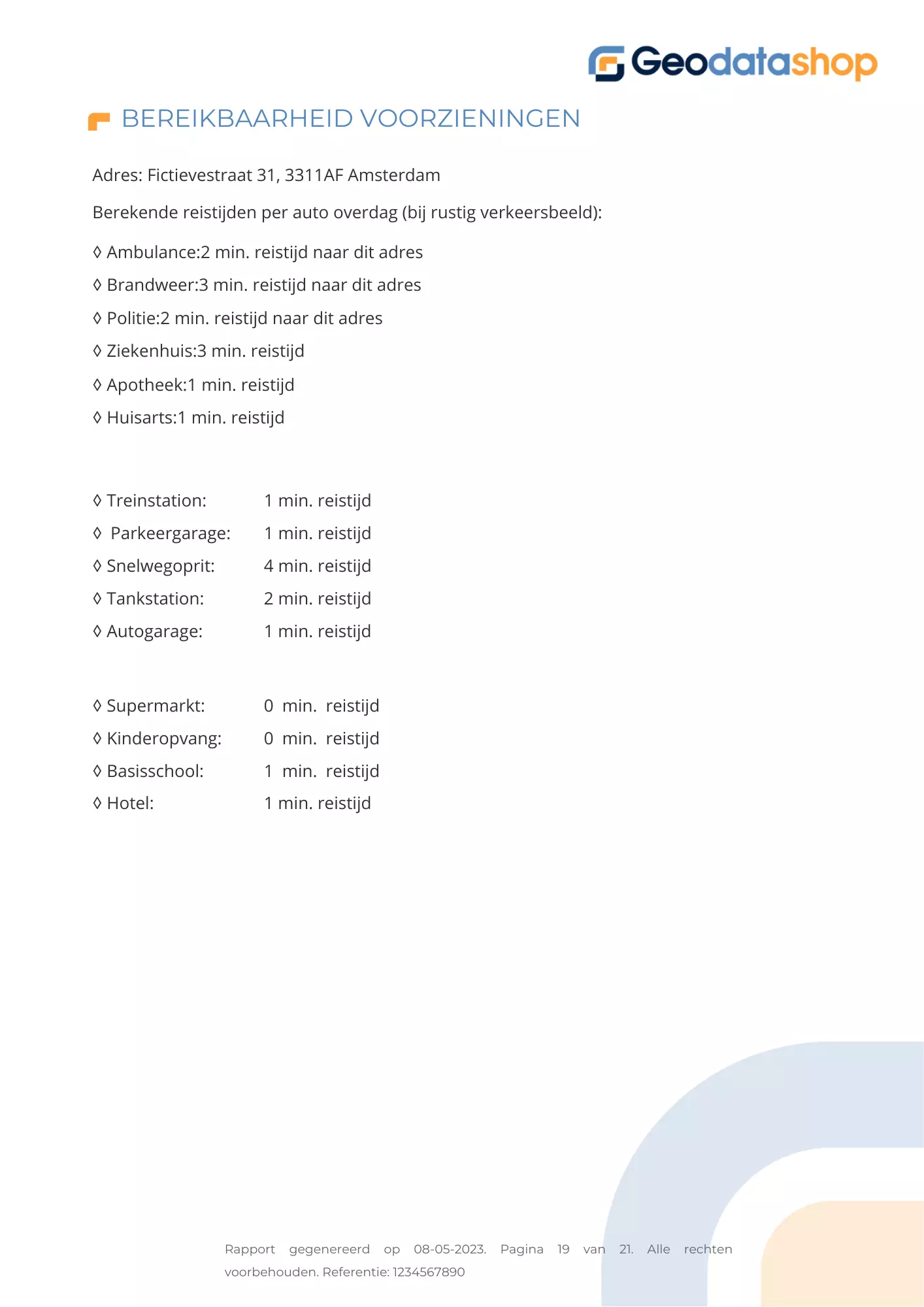 - Speciale activiteiten waaronder alle Handelsregister vermeldingen in het gebouw, de buurtleefbaarheid, het overstromingsrisico, buurtdemografie (bevolkingsopbouw), nutsvoorzieners, en reistijden per auto tot essentiële voorzieningen.