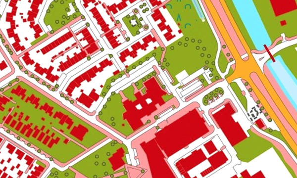 - Wegen: Inclusief type wegdek (asfalt, klinkers, gravel) en de ligging van rijbanen, fietspaden en trottoirs.