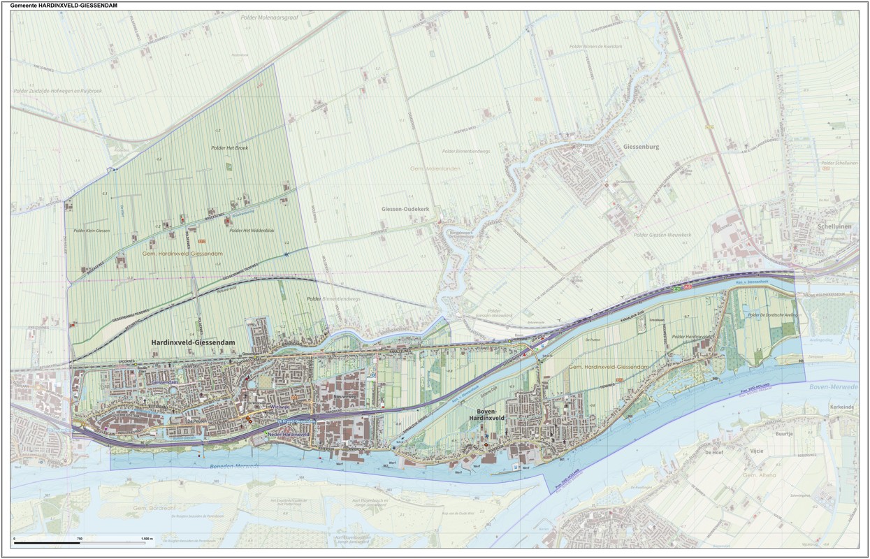 Gemeentekaart Hardinxveld-Giessendam, volgens de veelgebruikte TopoPlus-opmaak. Peildatum: juni 2023.