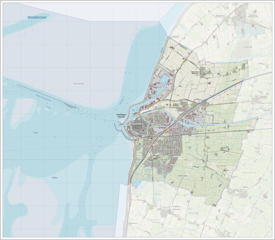 Gemeentekaart Harlingen, volgens de veelgebruikte TopoPlus-opmaak. Peildatum: juni 2023.