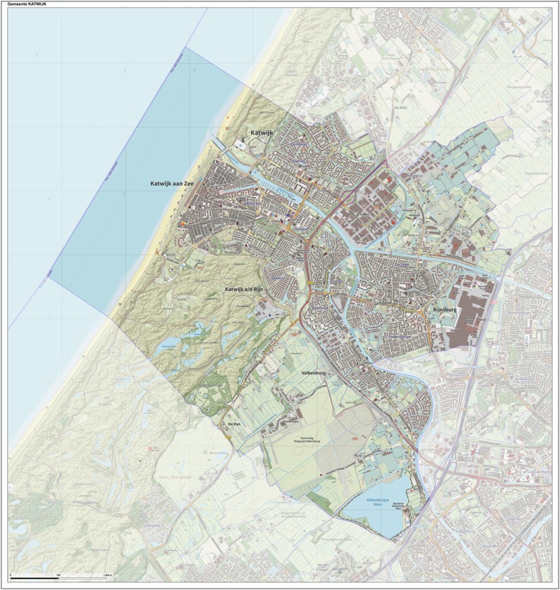 Gemeentekaart Katwijk, volgens de veelgebruikte TopoPlus-opmaak. Peildatum: juni 2023.