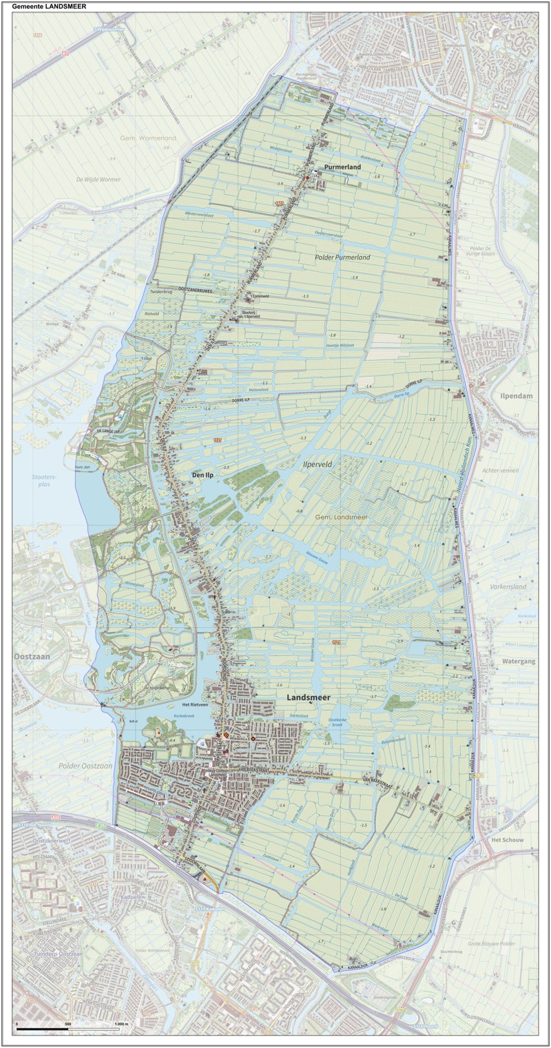Gemeentekaart Landsmeer, volgens de veelgebruikte TopoPlus-opmaak. Peildatum: juni 2023.
