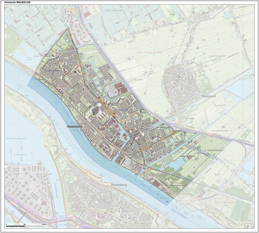 Gemeentekaart Maassluis, volgens de veelgebruikte TopoPlus-opmaak. Peildatum: juni 2023.