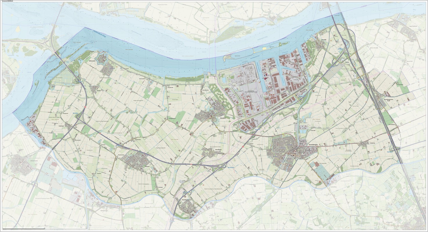 Gemeentekaart Moerdijk, volgens de veelgebruikte TopoPlus-opmaak. Peildatum: juni 2023.