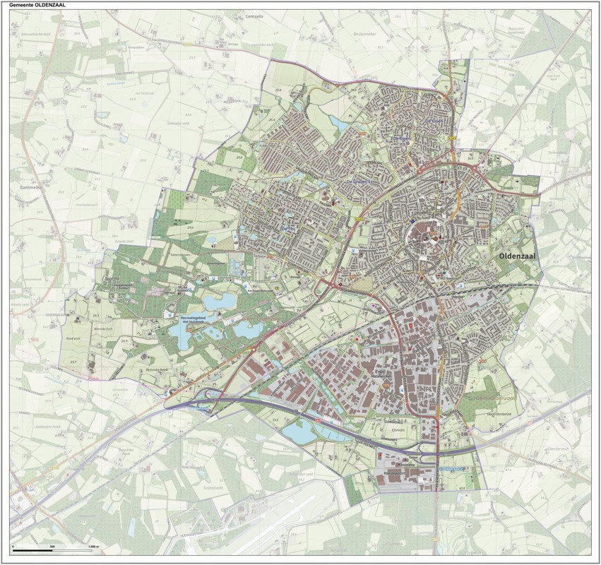 Gemeentekaart Oldenzaal, volgens de veelgebruikte TopoPlus-opmaak. Peildatum: juni 2023.
