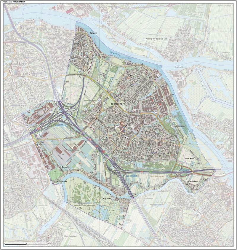 Gemeentekaart Ridderkerk, volgens de veelgebruikte TopoPlus-opmaak. Peildatum: juni 2023.