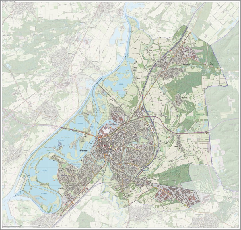 Gemeentekaart Roermond, volgens de veelgebruikte TopoPlus-opmaak. Peildatum: juni 2023.