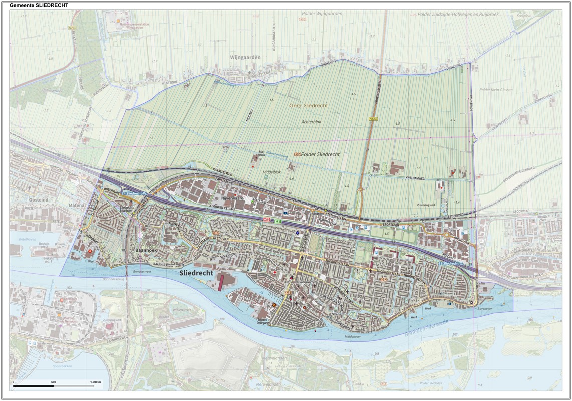 Gemeentekaart Sliedrecht, volgens de veelgebruikte TopoPlus-opmaak. Peildatum: juni 2023.