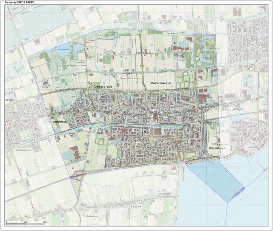 Gemeentekaart Stede Broec, volgens de veelgebruikte TopoPlus-opmaak. Peildatum: juni 2023.