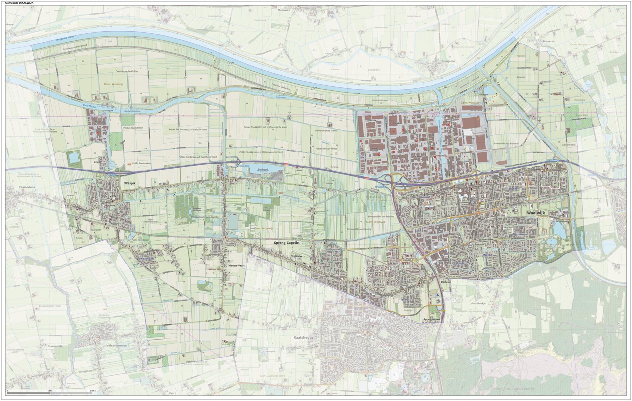 Gemeentekaart Waalwijk, volgens de veelgebruikte TopoPlus-opmaak. Peildatum: juni 2023.