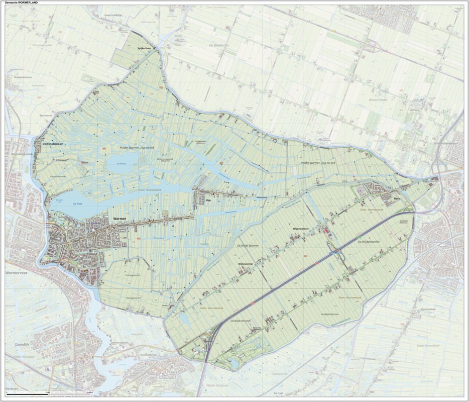 Gemeentekaart Wormerland, volgens de veelgebruikte TopoPlus-opmaak. Peildatum: juni 2023.