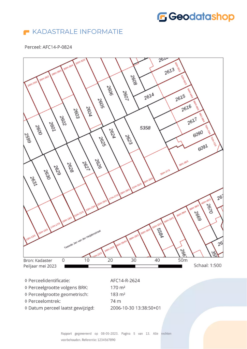 Informatie over een specifiek kadaster perceel, inclusief basisgegevens, luchtfoto’s, kadastrale kaart, maatvoeringkaart, bestemmingsplannen, en historische situatie.